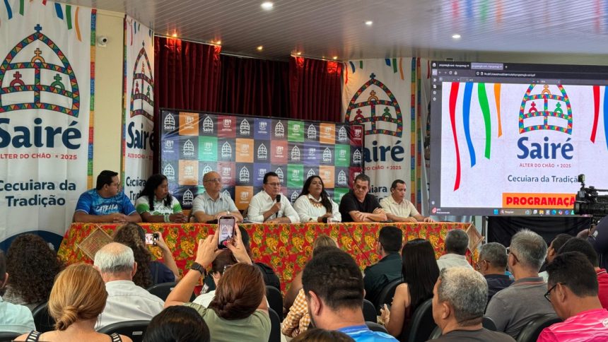 Na manhã desta terça-feira, 19, foi realizada uma coletiva de imprensa para apresentar a programação oficial do Sairé 2025. Durante o encontro, foram destacados os eventos que antecedem a programação principal. “No mês de julho, fizemos o lançamento do tema do Sairé em Alter do Chão e aqui na cidade. As agremiações dos Botos Cor de Rosa e Tucuxi também realizaram eventos para lançar os temas que irão defender este ano. Estamos trabalhando desde o início do ano para mostrar que o Sairé não se resume apenas ao mês de setembro. Nossa cultura é fortalecida não só pelas pessoas que acompanham esses grandes eventos, mas também por aquelas que fazem cultura. Cada etapa do Sairé é pensada, vivida e celebrada pela própria comunidade. É uma festa que nasce das mãos do povo e carrega nossa identidade”, destacou a secretária municipal de Cultura (SEMC), Priscila Castro.