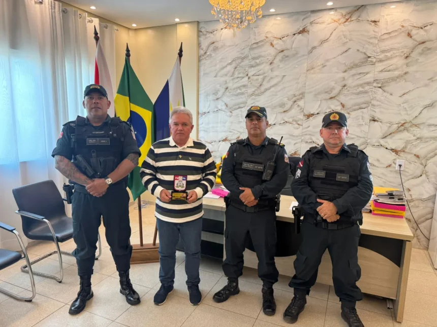 A cerimônia ocorreu no gabinete municipal e contou com a presença do coronel Aleixo, comandante do Comando de Policiamento Regional I (CPR I), do tenente-coronel Eduardo Carvalho, comandante do batalhão, e do 1º sargento Alexandro, responsável pelo 6º Pelotão de Polícia Militar.