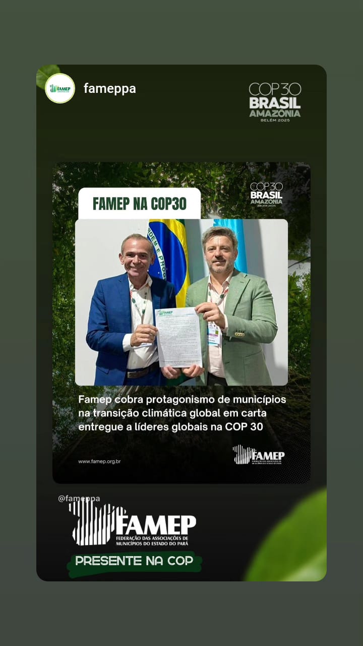 Durante a COP30, em Belém, o Presidente da FAMEP, Nélio Aguiar, entregou uma Carta Aberta às Lideranças Globais, reforçando um recado essencial: “Não existe transição climática justa sem os municípios”.