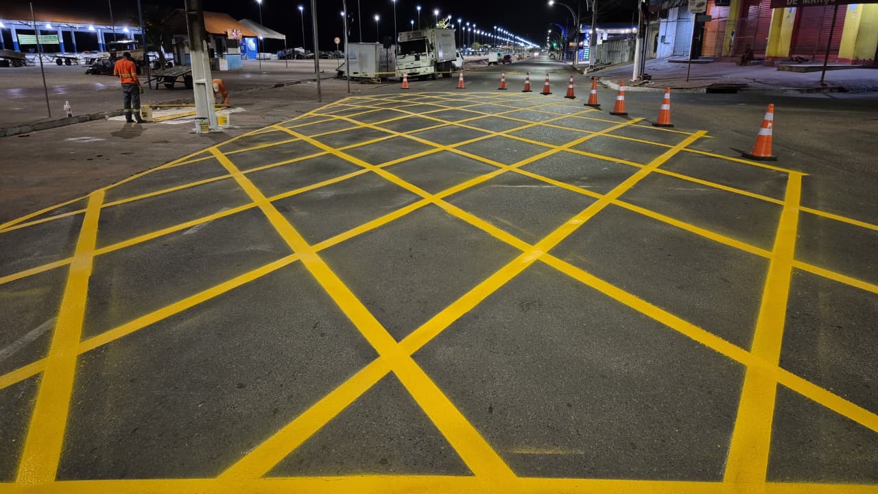 A Prefeitura de Santarém, por meio da Secretaria Municipal de Mobilidade e Trânsito (SMT), realizou mais uma ação de reforço à segurança viária na área central da cidade. Durante a madrugada de terça-feira (25), equipes de sinalização concluíram a revitalização da Marcação da Área de Conflito – área demarcada, com pintura amarela quadriculada, que indica o ponto de intersecção de vias onde os veículos não devem parar ou estacionar para evitar o bloqueio do cruzamento – no cruzamento da Avenida Tapajós com a Travessa Professor Antônio de Carvalho. O trecho, localizado entre o Mercado do Peixe e o Mercadão 2000,  reconhecido como uma das áreas de maior movimentação de veículos, motocicletas, caminhões que abastecem os mercados e pedestres que circulam pelo complexo portuário.
