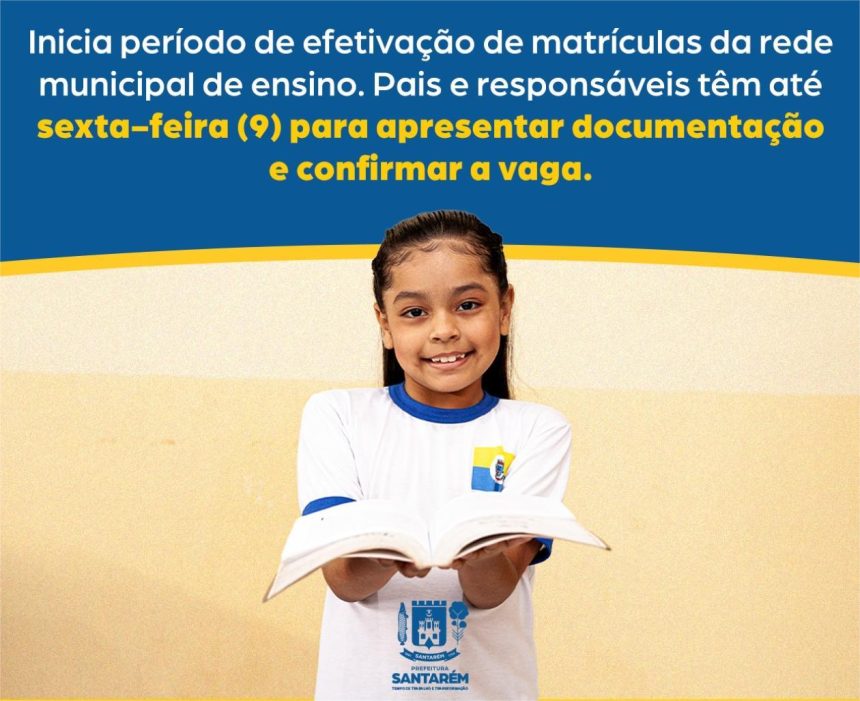 Iniciou na terça-feira (6) e segue até sexta-feira (9) o período de efetivação das matrículas previamente feitas pelo sistema Educa + referentes ao ano letivo de 2026. O processo de matrículas dos alunos na Rede Municipal de Ensino (Educação Infantil, Ensino Fundamental, Educação de Jovens e Adultos – EJA e Educação em Tempo Integral) foi realizado 100% online, pelo site da Prefeitura de Santarém.
