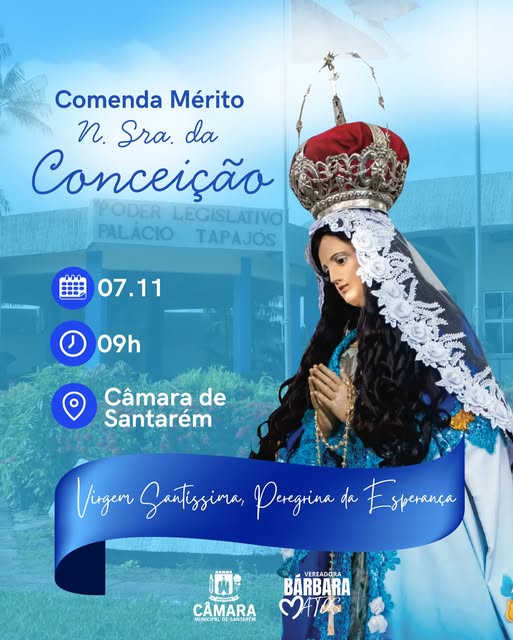 E para celebrar esse tempo especial de fé e devoção, a Câmara Municipal de Santarém realizará, por proposição da vereadora Bárbara Matos (PP), nesta sexta-feira, 7 de novembro, às 09h, a Sessão Especial de entrega da Comenda Mérito Nossa Senhora da Conceição.