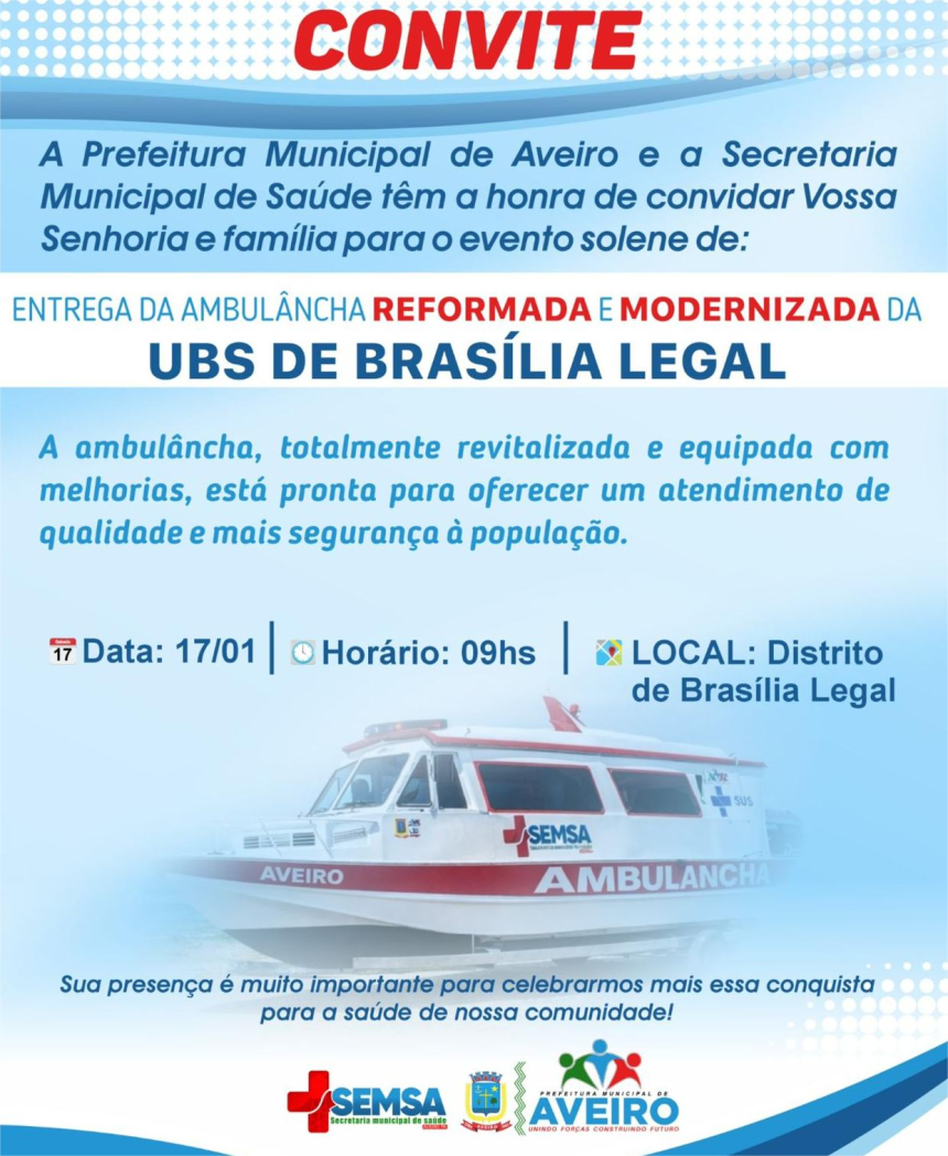 A Prefeitura Municipal de Aveiro, através da Secretaria Municipal de Saúde, está convidando a população do Município para o evento solene de entrega da ambulâncha reformada e modernizada da UBS de Brasília Legal, que acontecerá no próximo sábado, dia 17 de janeiro, a partir das 09 horas, no Distrito de Brasília Legal.