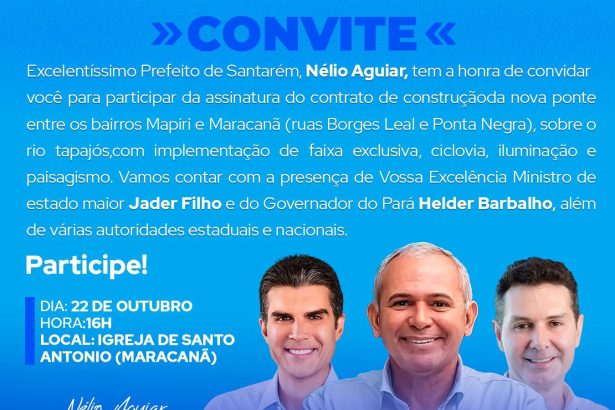 O Ministro das Cidades, Jader Filho, estará em Santarém nesta terça-feira, dia 22 de outubro, para a assinatura do Contrato para construção da ponte que ligará os bairros do Mapiri…