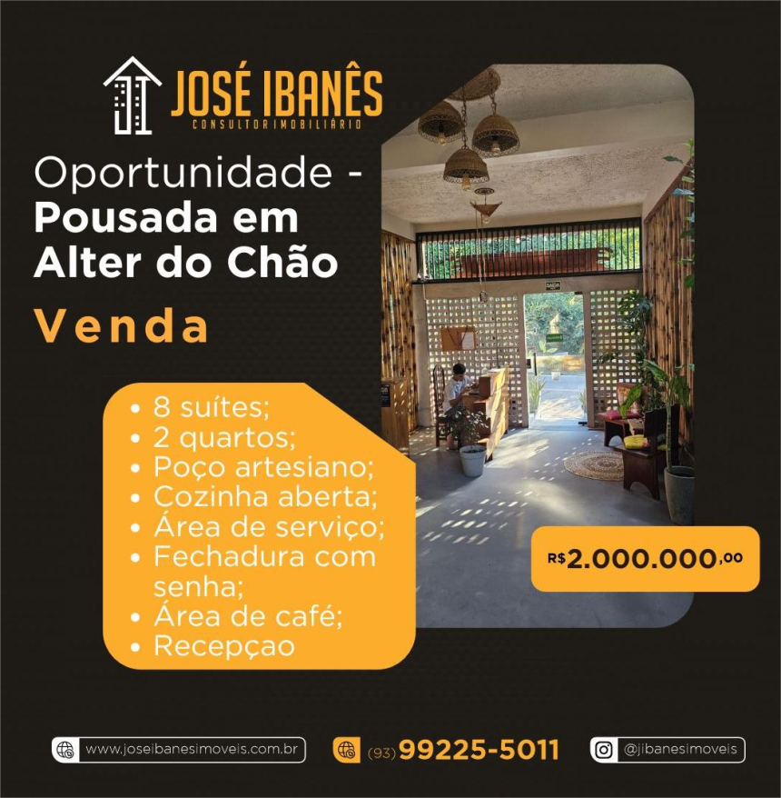 Uma grande oferta e oportunidade. Vende-se uma pousada completa em Alter do Chão, no município de Santarém – Pará, que é um dos pontos mais visitados por turistas do Brasil e do mundo, e que possui o maior aquífero de água doce do mundo.